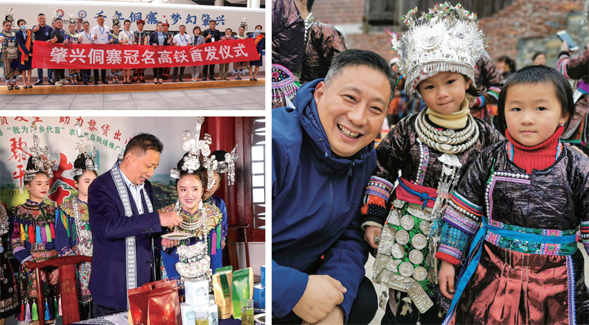 圖1-3:參加肇興侗寨高鐵冠名儀式/張萬廣直播帶貨的場面/張萬廣與黎平縣的孩子們合影