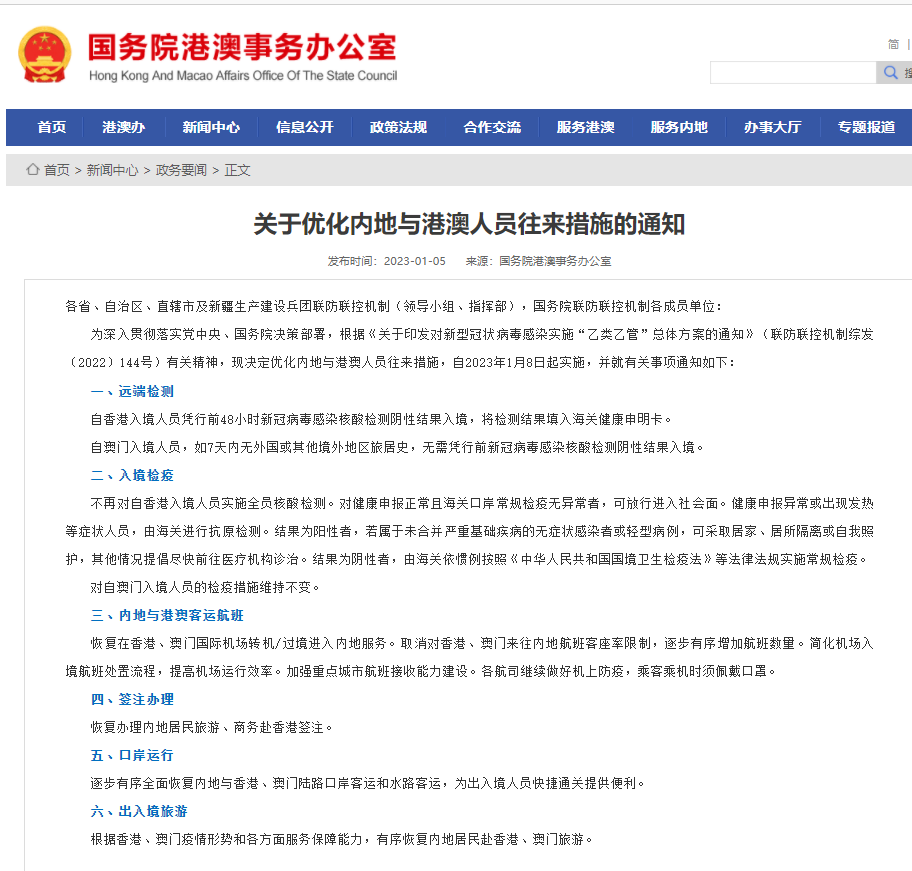 不再對(duì)自香港入境人員實(shí)施全員核酸檢測(cè)。對(duì)健康申報(bào)正常且海關(guān)口岸常規(guī)檢疫無(wú)異常者,可放行進(jìn)入社會(huì)面。健康申報(bào)異?;虺霈F(xiàn)發(fā)熱等癥狀人員,由海關(guān)進(jìn)行抗原檢測(cè)。