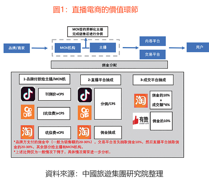 直播電商各方的價(jià)值環(huán)節(jié)主要以CPS(Cost per Sale,效果行銷)體現(xiàn)。品牌/商家提供貨源,對(duì)接紅人/主播/MCN機(jī)構(gòu),商定產(chǎn)品和直播文案,最終引導(dǎo)消費(fèi)者在直播平臺(tái)進(jìn)行商業(yè)轉(zhuǎn)化。主播/MCN 機(jī)構(gòu)、直播平臺(tái)、交易平臺(tái)根據(jù)銷售額按比例抽傭,比例高低取決於各方在產(chǎn)業(yè)鏈上的地位和銷售策略,另外品牌會(huì)額外給主播一筆固定的產(chǎn)品上架費(fèi)。