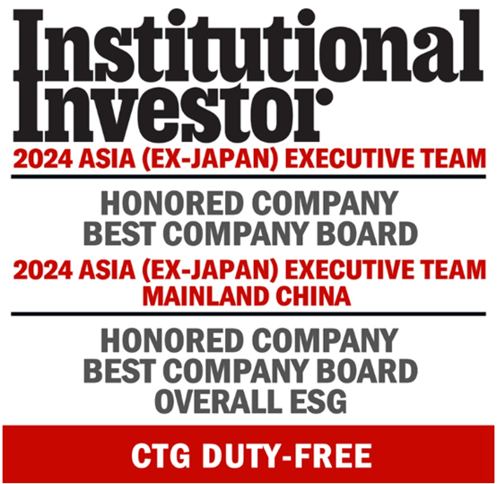 近日,國際權(quán)威金融雜志《Institutional Investor》公布了備受矚目的“2024年度亞洲最佳管理團(tuán)隊(duì)”評(píng)選結(jié)果。經(jīng)全球近6,000名基金經(jīng)理和分析師投票,中旅免稅榮登亞洲地區(qū)及中國大陸地區(qū)雙榜單,并在可選消費(fèi)品類別中榮膺多個(gè)重磅獎(jiǎng)項(xiàng):評(píng)選為“受尊崇企業(yè)”,榮獲“最佳董事會(huì)”(位列雙榜單第二名),“整體ESG表現(xiàn)”位列中國大陸地區(qū)榜單第三名。