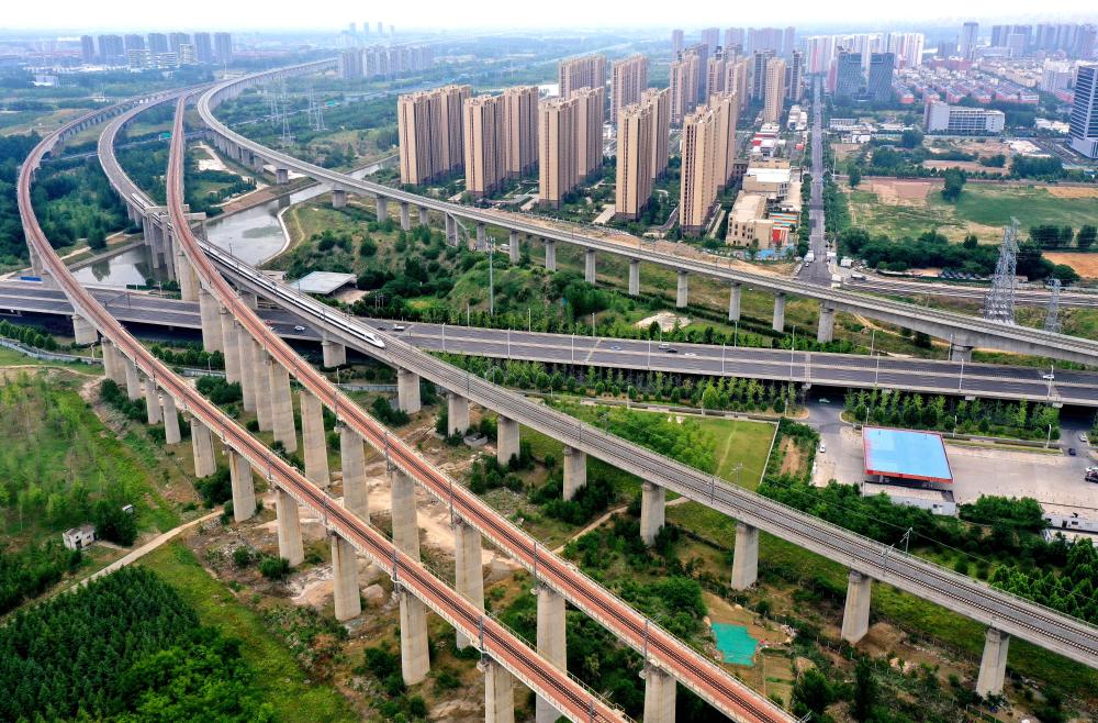??2024年5月30日,一列動(dòng)車組列車行駛在鄭州東站附近的線路上。(新華社發(fā))