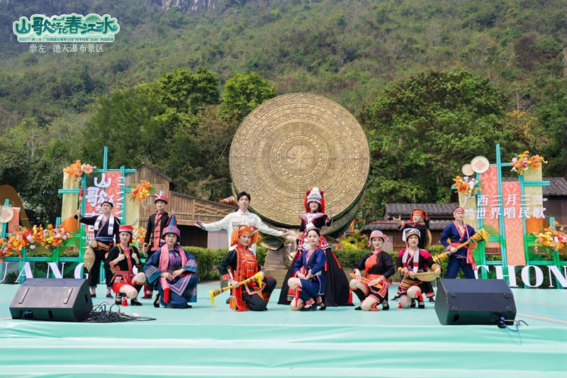 3月26日,2025“廣西三月三”民歌擂臺賽暨全國“四季村歌”活動廣西選拔賽及“壯錦國潮首發(fā)季·2025春夏新品發(fā)布會”在中旅國際所屬廣西德天跨國瀑布景區(qū)舉辦。來自全區(qū)的15支代表隊,依托以銅鼓廣場等景區(qū)地標為背景的山水舞臺與越南歌手隔河對唱,結(jié)合中越民族表演和精美的壯錦非遺作品,為游客獻上一場沉浸式文化盛宴。