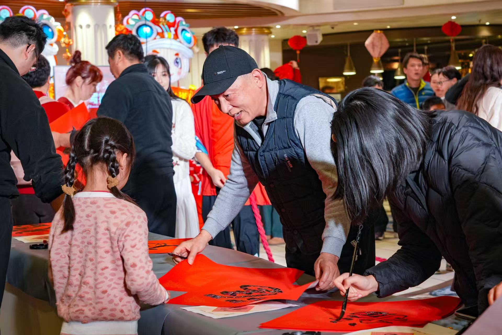 “愛(ài)達(dá)?魔都”號(hào)除了舉辦寫(xiě)春聯(lián)、剪紙等傳統(tǒng)手工藝活動(dòng)外,還帶來(lái)舞獅講堂等互動(dòng)環(huán)節(jié),讓中外旅客近距離感受中華傳統(tǒng)文化的魅力?!皭?ài)達(dá)?地中?!碧?hào)特邀國(guó)家級(jí)非遺項(xiàng)目佛山彩燈代表性傳承人黃敏言與國(guó)家級(jí)非遺項(xiàng)目佛山木版年畫(huà)代表性傳承人劉鐘萍登船,指導(dǎo)旅客制作寓意 "魚(yú)躍福來(lái)" 的迷你彩燈,刷印吉祥年畫(huà),感受具有嶺南韻味的非遺文化?!肮睦藥Z”號(hào)上的旅客們踴躍參與書(shū)法賜福、燈籠制作等特色互動(dòng),共同度過(guò)充滿文化氛圍的“海上中國(guó)年”。