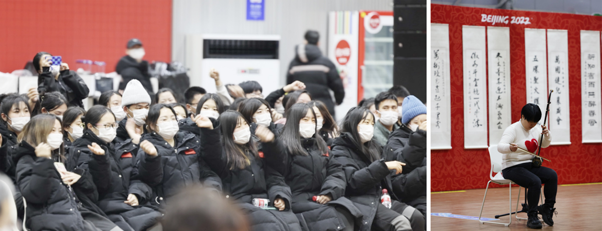 活動(dòng)中有樂(lè)器演奏,二胡演奏的旋律婉轉(zhuǎn)而悠長(zhǎng)。事業(yè)群宣傳工作組專程送來(lái)節(jié)目,大家靜靜地聽,記憶如白駒過(guò)隙,冬奧村內(nèi)節(jié)奏快、任務(wù)重,而大家庭成員坐下來(lái)一起來(lái)欣賞民族樂(lè)器演奏,這是第一次。