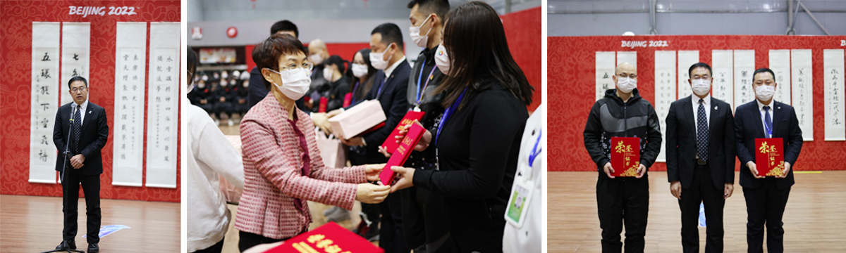 活動(dòng)現(xiàn)場(chǎng),賈凱副部長(zhǎng)發(fā)表了熱情洋溢的講話,他從參與中旅酒店誓師大會(huì)開始憶往昔,到憧憬冬奧會(huì)服務(wù)現(xiàn)場(chǎng)盛況來(lái)勵(lì)征程。他表示,服務(wù)這樣一場(chǎng)國(guó)際賽事大家要感到榮幸和自豪,要勇于擔(dān)當(dāng)和奉獻(xiàn),在學(xué)習(xí)中得到成長(zhǎng),堅(jiān)定信心履職盡責(zé),以“冬奧盛會(huì)必定有我,精彩冬奧成就大我,服務(wù)奧運(yùn)我將無(wú)我”的決戰(zhàn)姿態(tài)迎接冬奧會(huì)開幕。中旅酒店黨委委員、副總經(jīng)理、冬奧會(huì)項(xiàng)目前方總指揮陳月亮轉(zhuǎn)達(dá)了集團(tuán)領(lǐng)導(dǎo)對(duì)現(xiàn)場(chǎng)團(tuán)隊(duì)的新年祝福。晚會(huì)前舉行了簡(jiǎn)短的表彰儀式,對(duì)2021年4月誓師會(huì)以來(lái)表現(xiàn)較好的員工給予表彰,用榜樣的力量來(lái)感染人、鼓舞人,倡導(dǎo)大家人人爭(zhēng)做榜樣、爭(zhēng)做先鋒。簡(jiǎn)短的頒獎(jiǎng)活動(dòng)過(guò)后,跨年元旦晚會(huì)正式拉開帷幕。