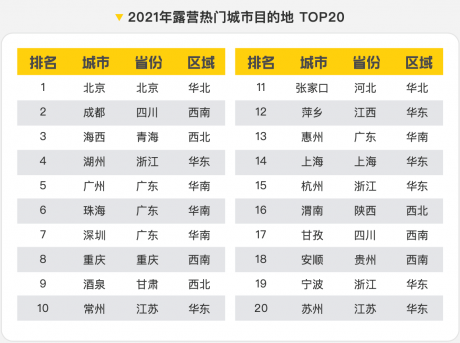 來自一線及新一線城市的消費者是露營的主要客源,對他們來說,露營不僅僅是換個地方睡覺,更是逃離喧囂生活的心靈棲息。其中,北京、成都、上海、廣州包攬露營客源地前四,對露營總游客量的貢獻超過三成。