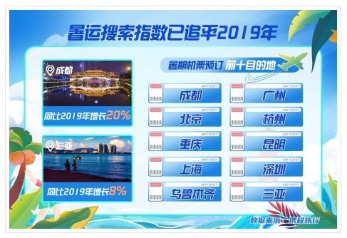 FlightAI數(shù)據(jù)顯示,暑期機(jī)票預(yù)訂排名靠前的目的地城市有:成都、廣州、北京、杭州、重慶、昆明、上海、深圳、烏魯木齊、三亞。排名第一的成都,暑期機(jī)票預(yù)訂量同比2019年增幅超過20%;除此之外,三亞游預(yù)訂量同比也有增長(zhǎng),增幅8%。