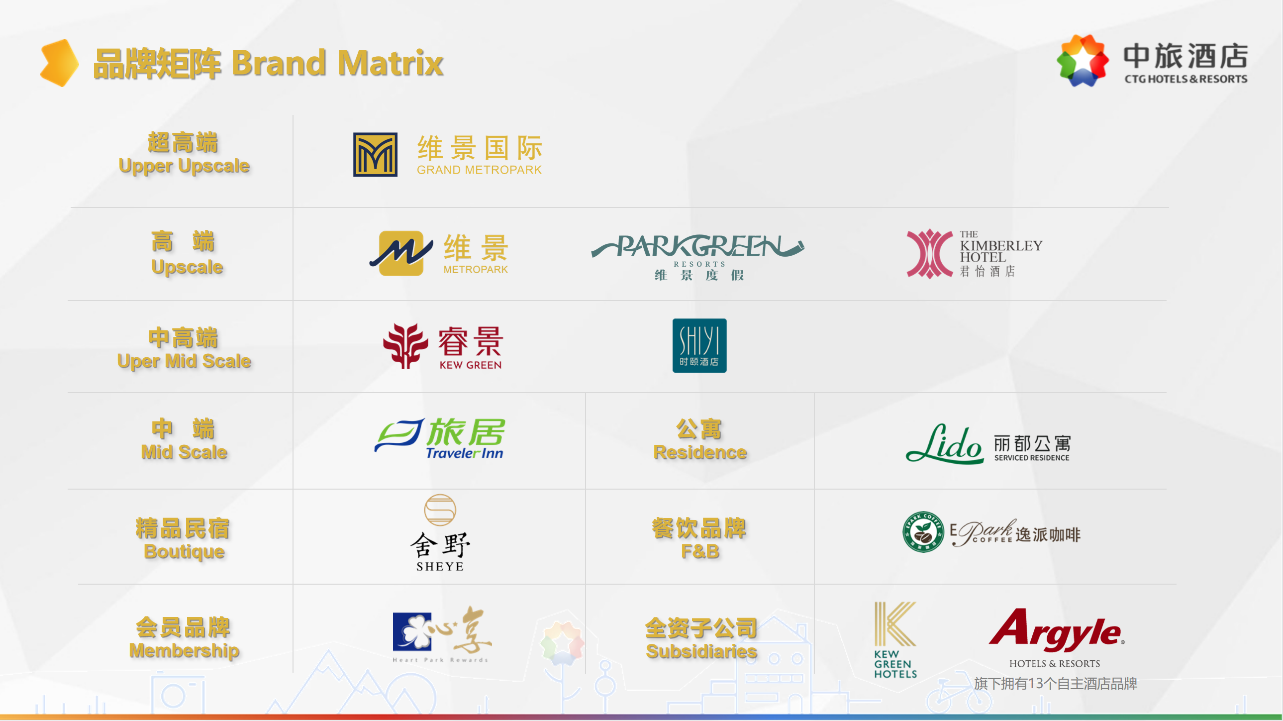 中旅酒店旗下?lián)碛小熬S景國(guó)際”“維景”“睿景”“旅居”“麗都公寓”“雅閣”“澳斯特”等二十余個(gè)品牌,覆蓋超高端、高端、中高端、中端、公寓、民宿等各類產(chǎn)品線,全資控股英國(guó)KG酒店集團(tuán),戰(zhàn)略投資雅閣酒店集團(tuán)。